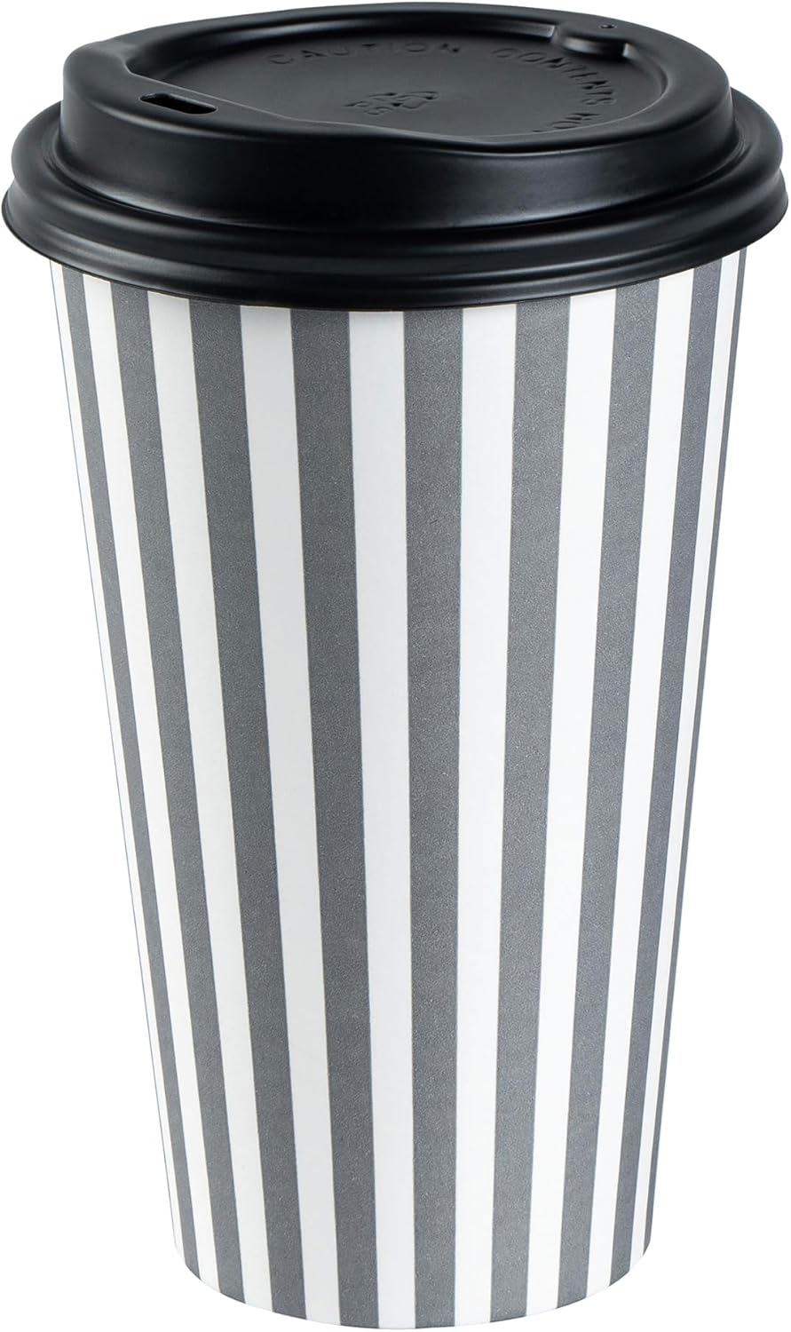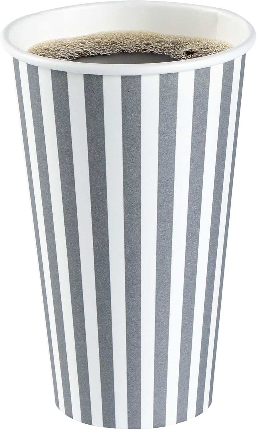 Enjoy your hot or cold beverages with our Restpresso 16-ounce Gray and White Stripe Paper Single Wall Coffee Cups. Each of these paper coffee cups is crafted with a greaseproof PE liner, ensuring your drinks stay within the cup and not on your hands. These disposable hot cups come equipped with a black lid, providing an easy solution to reduce spills during your daily commute. Boasting a unique single wall design, these coffee cups are perfect for all kinds of drinks, making them a versatile choice for all your beverage serving needs. The eye-catching gray and white stripe finish of these single-use coffee cups adds a stylish touch to your morning coffee run or afternoon tea break. The rolled rim and durable seam of these disposable hot cups add to their premium construction, ensuring a comfortable and enjoyable drinking experience for your customers. Match these coffee cups with our range of cup sleeves designed to enhance gripping ability, reducing the chances of accidental spills or slips. With a generous capacity of 16 ounces, these single use coffee cups are perfect for serving a range of beverages, from lattes to iced teas. Measuring 3.5 inches in diameter by 5.5 inches in height, these hot tea cups are the perfect size for on-the-go drinking. Sold in a 400 count box. Sleeves are available and sold separately.