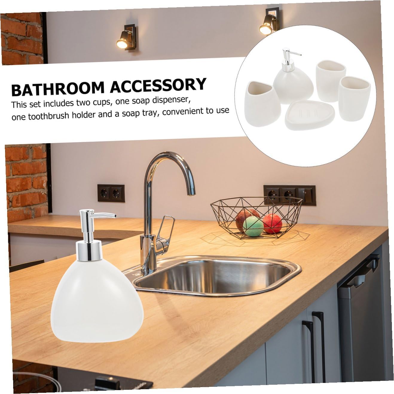 Package Include 1 x Soap Dispenser 1 x Toothbrush Holder 2 x Cups 1 x Soap Box Characteristics -Size: About 17.00X12.00X12.00cm/6.68X4.72X4.72in Soap Tray -Color: White Personal Washing Cup -Material: Ceramic Toothbrush Holder - All item come with the compact size, which will not take up too much space Bathroom Supplies. - The accessories are made of material, which has the Bathroom Supply. - The set includes 5pcs, which can meet your different needs Toothbrush Cup. - Feature the smooth surface, making them convenient to clean Bathroom Washing Accessory. - Fine workmanship ensures the practicality and durability Gargle Cup.Goods InformationPersonal Washing Cup This simple, elegant and stylish bathroom accessories set will bring character and life to any bathroom.Bathroom Supplies They help protect your surfaces and keep your bathroom tidy and organized.Gargle Cup All items are made of material.Toothbrush Cup Chic appearance also make them preferred present for your friends